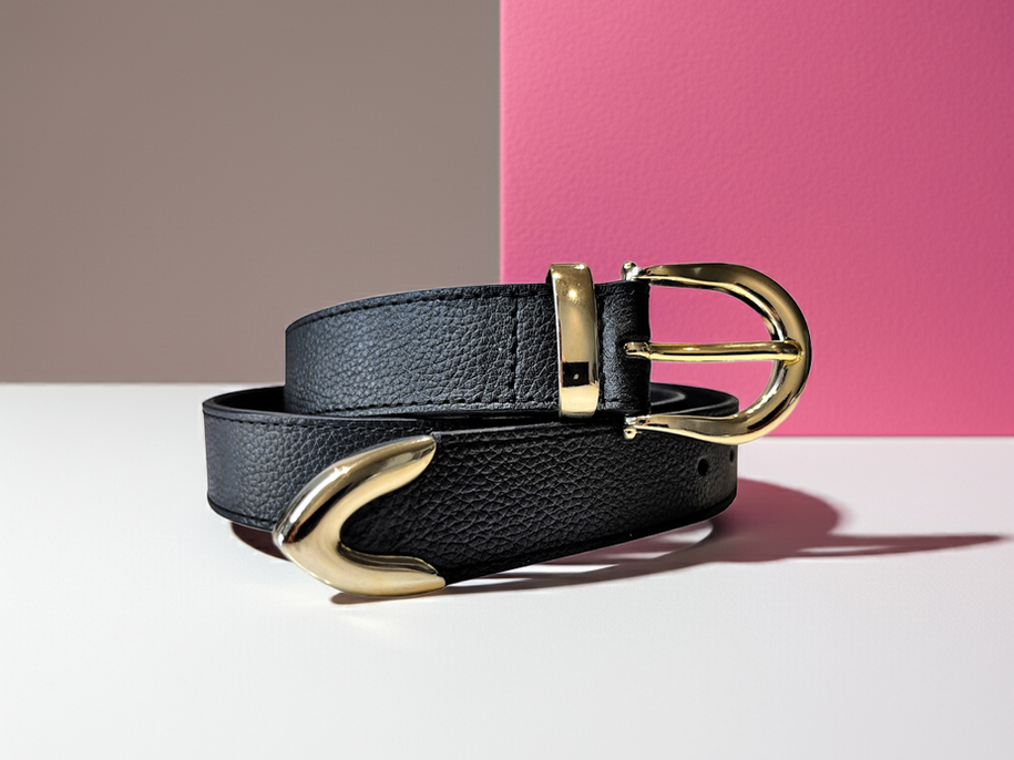 - Hebilla dorada ovalada, con trabilla metálica